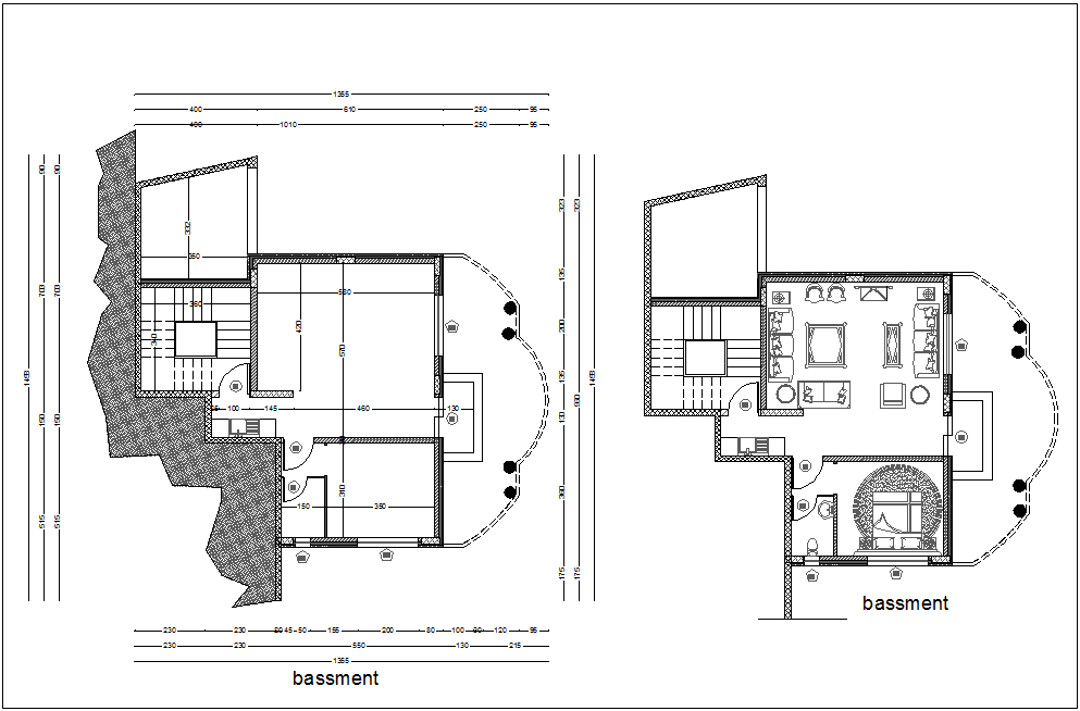 Basement floor plan view of house with architectural view dwg file