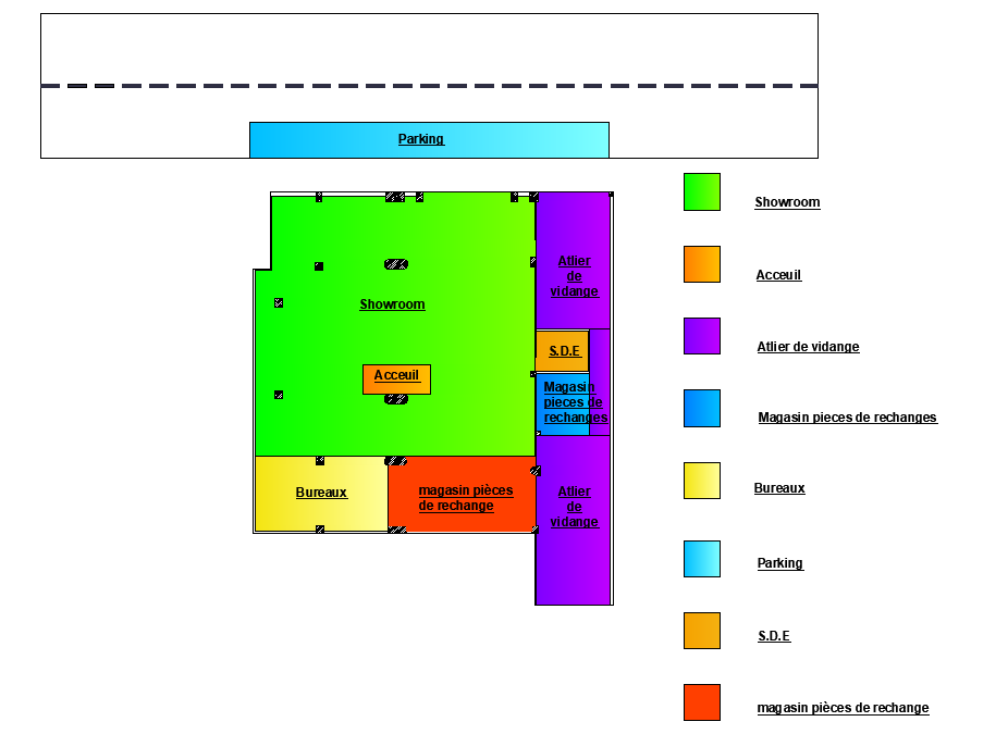 Zone show room Renault layout file, coloring detail, naming detail, column detail, parking detail, etc.