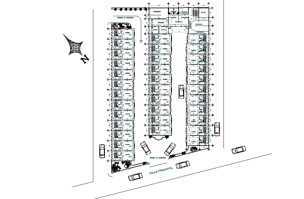 Auto hotel motel planning layout file, north direction detail, centre line detail, car parking detail, furniture detail in door and window detail, stair detail, etc.