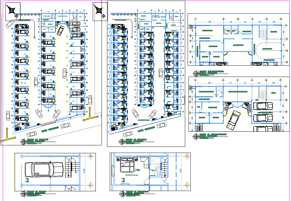 Hotel room and parking plan autocad file, car parking detail, centre line plan detail, dimension detail, naming detail, furniture detail in door, bed and window detail, stair detail, toilet detail, etc.