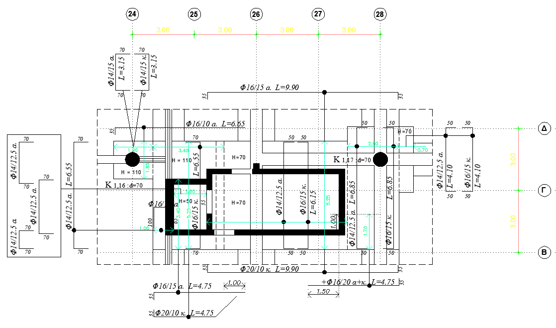 Plan Part of foundations detail dwg file, centre line plan detail, dimension detail, naming detail, hidden line detail, etc.