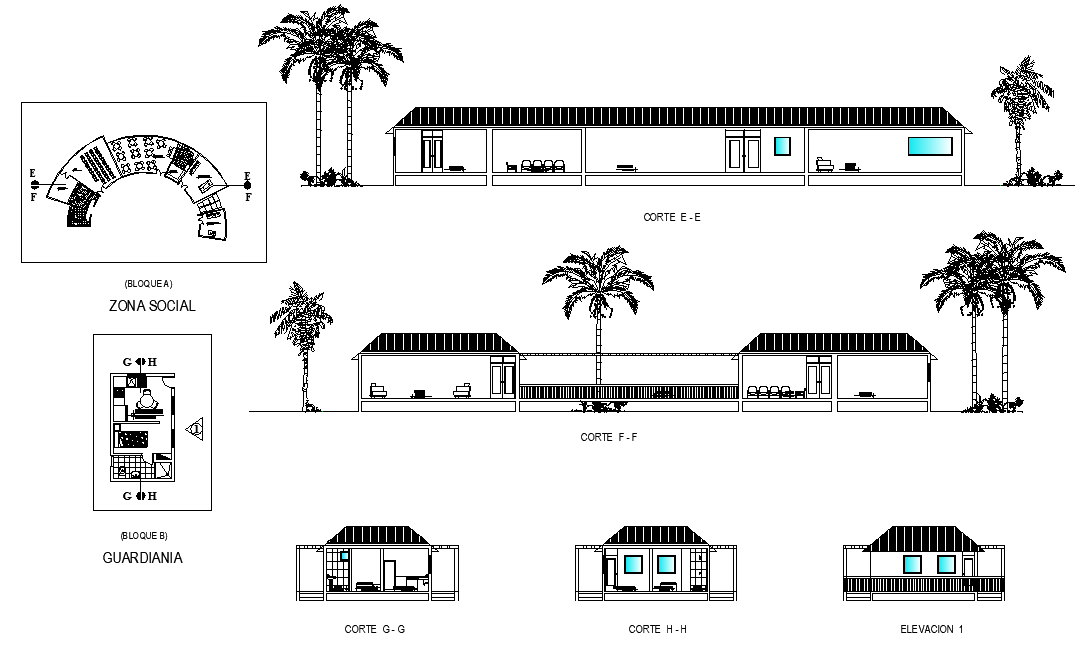 Section and elevation tourist hostel plan autoacd file, side elevation detail, section E-E’ detail, section F-F’ detail, section G-G’ detail, section H-H’ detail, landscaping detail in tree and plant detail, section line detail, toilet detail, etc.