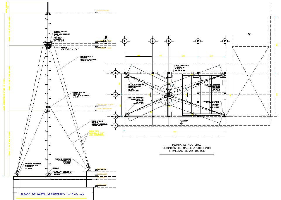 Guying mast 15 meters layout file, centre line plan detail, dimension detail, naming detail, hidden line detail, hidden line detail, etc.