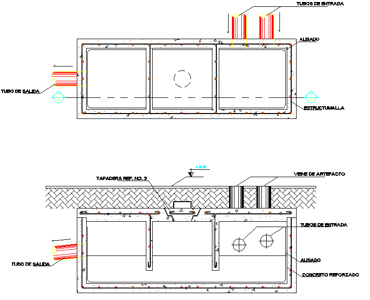Sanitary boxes plan and section detail dwg file, section line detail, concrete mortar detail, naming detail, pipe detail, reinforcement detail, bolt nut detail, etc.