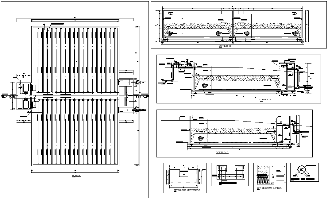 Slow filter plan and section autocad file, dimension detail, naming detail, section A-A’ detail, section B-B’ detail, section C-C’ detail, concrete mortar detail, reinforcement detail, bolt nut detail, etc.