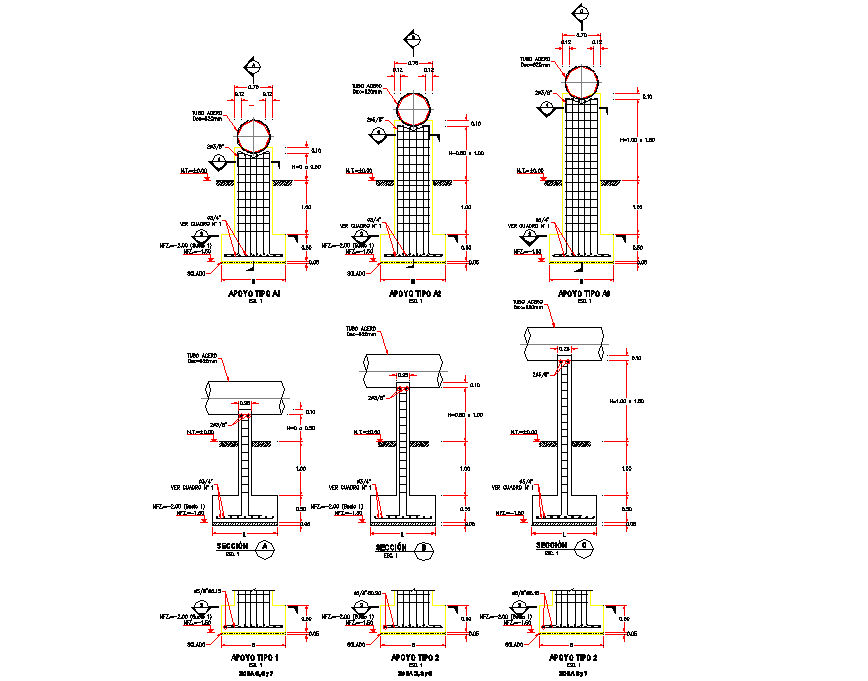 Detail Concrete supports dwg file, centre line detail, naming detail, dimension detail, reinforcement detail, bolt nut detail, pipe line detail, etc.