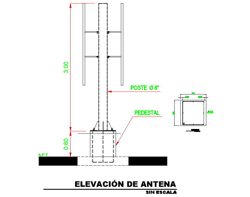 Antenna elevation autocad file, dimension detail, naming detail, hidden line detail, bolt nut detail, reinforcement detail, etc.