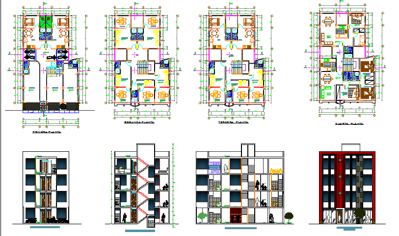 Housing building with offices and stores auto-cad details that includes a detailed view of front and back elevation view, front and back sectional view, flooring view, staircase view, doors and windows view, tree view, car parking view, floor plan layout with shops, stores, offices, main entry door, living area, family hall, kitchen, dining area, bedroom, master bedroom, laundry area and much more of housing building project.