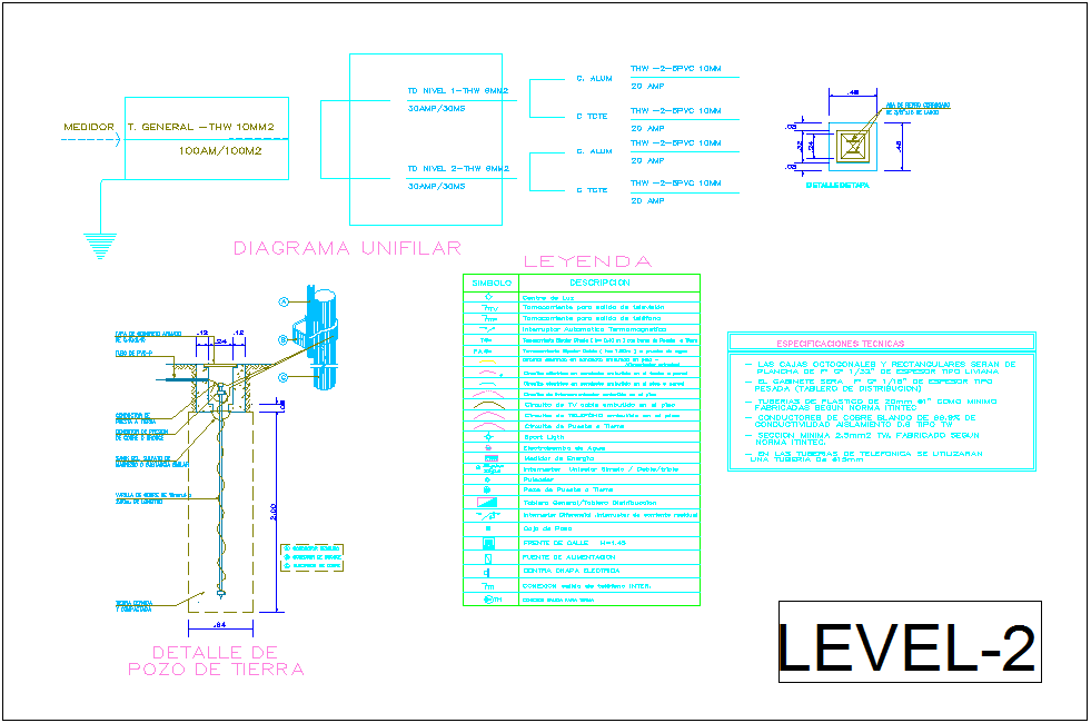 Detail of electrical with view of house for second level dwg file in detail view with level first floor with well of earth and unify diagram and clamp view with its isometric view with lid detail and view with legend necessary detail and dimension.