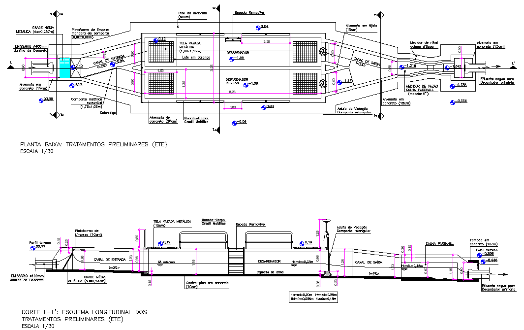 Section Waste water treatment shredder autocad file, section line detail, dimension detail, naming detail, leveling detail, scale 1:30 detail, hatching detail, etc.