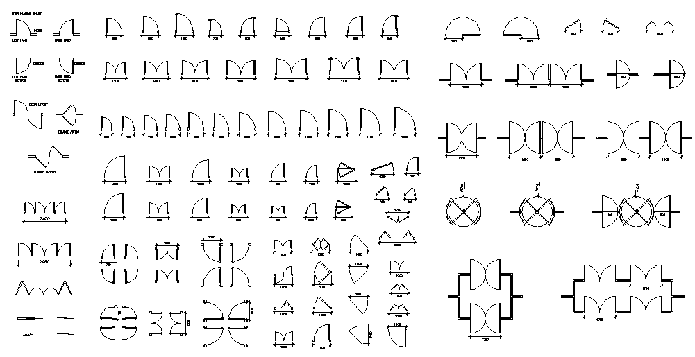 Door plan dwg file. Top view of different type of door handing chart , inside , outside , left hand and right hand door .door layout with double avting , double egress. door cad block.