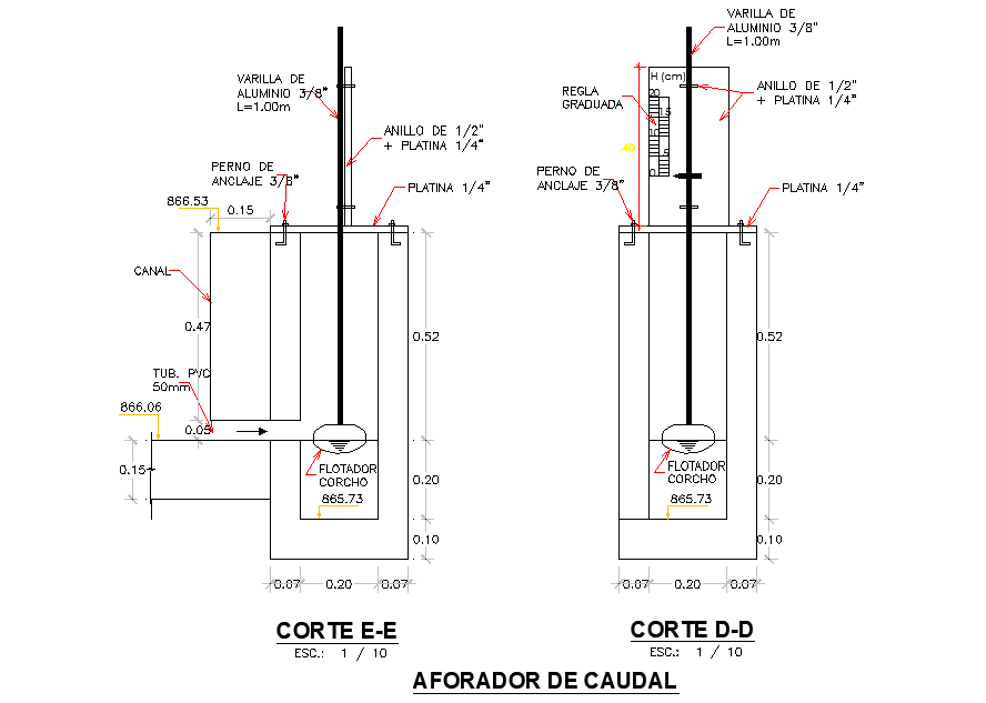 Flow gauge section layout file, dimension detail, naming detail, reinforcement detail, scale 1:10 detail, PVC pipe detail, etc.