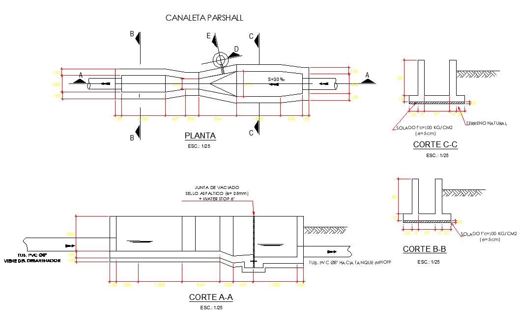 Parshall trough plan and section detail dwg file, section line detail, section A-A’ detail, section B-B’ detail, section C-C’ detail, dimension detail, naming detail, ground level detail, etc.