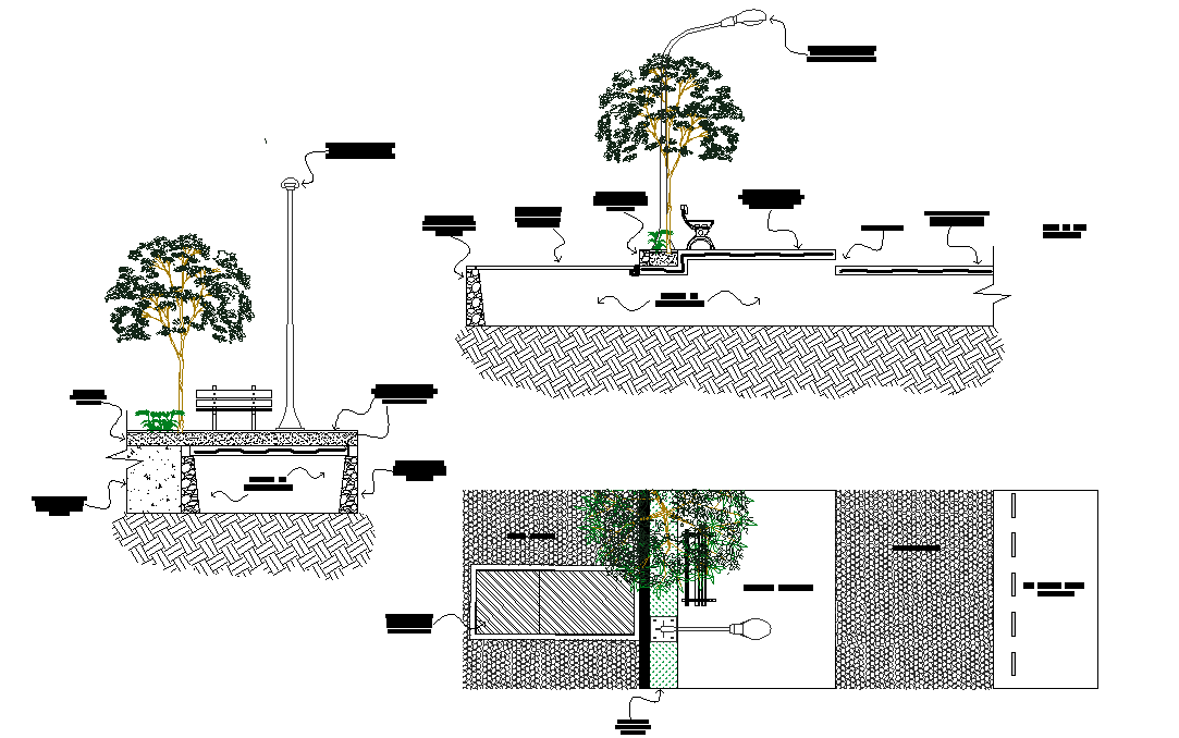 Pluvial sewer section autocad file, naming detail, landscaping detail in tree and plant detail, concrete mortar detail, hatching detail, stone detail, etc.
