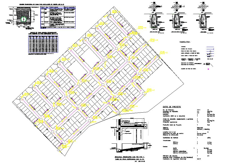 Sanitary sewage network layout file, specification detail, table detail, dimension detail, naming detail, symbol detail, main hole section detail, etc.