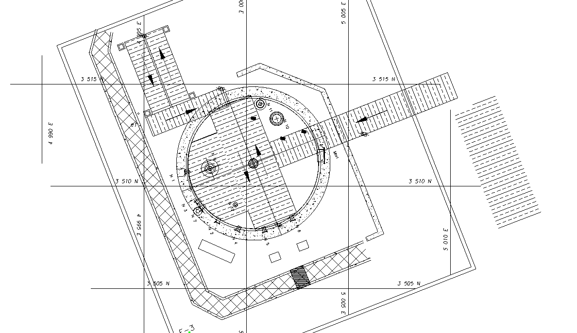 Water treatment plant plan autoacd file, dimension detail, naming detail, concrete mortar detail, hatching detail, grid lien detail, etc.