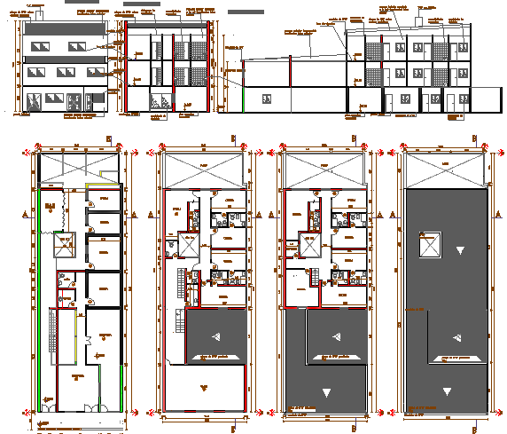 Professional offices and library three floors auto-cad details that includes a detailed view of elevations, sections, flooring view, doors and windows view, floor plan layout with ground floor, first floor, second floor etc with main entry and exit gate, reception area, front desk, waiting and seating area, employee offices, employee desk, meeting hall, conference hall, dining area, cafeteria, smoking zone, sanitary facilities, studio, cleaning department and much more of corporate building project.
