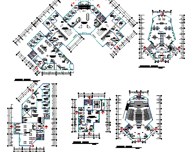 Floor plan and layout plan details of finance center building that includes a detailed view of ground floor, first floor, second floor etc with main entry and exit gate, reception area, front desk, waiting and seating area, employee offices, employee desk, meeting hall, conference hall, dining area, cafeteria, smoking zone, sanitary facilities, studio, cleaning department and much more of office building.