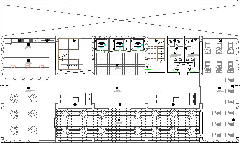 Administrative building architecture layout plan details that includes a detailed view of main entry and exit gate, reception area, front desk, waiting and seating area, employee offices, employee desk, meeting hall, conference hall, dining area, cafeteria, smoking zone, sanitary facilities, studio, cleaning department and much more of office building.