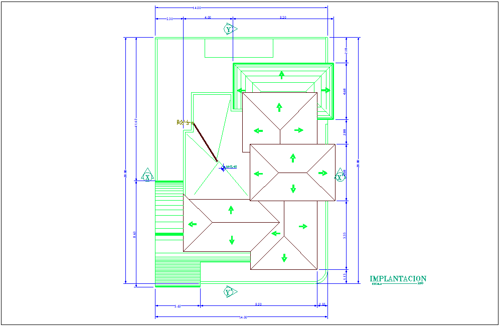 Cover plan of implantation for duplex house dwg file in plan with view of cover plan with view of roof area and view with necessary dimension.