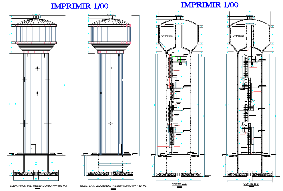 Elevation 150m3 reservoir layout file, dimension detail, front elevation detail, side elevation detail, stair detail, reinforcement detail, bolt nut detail, etc.