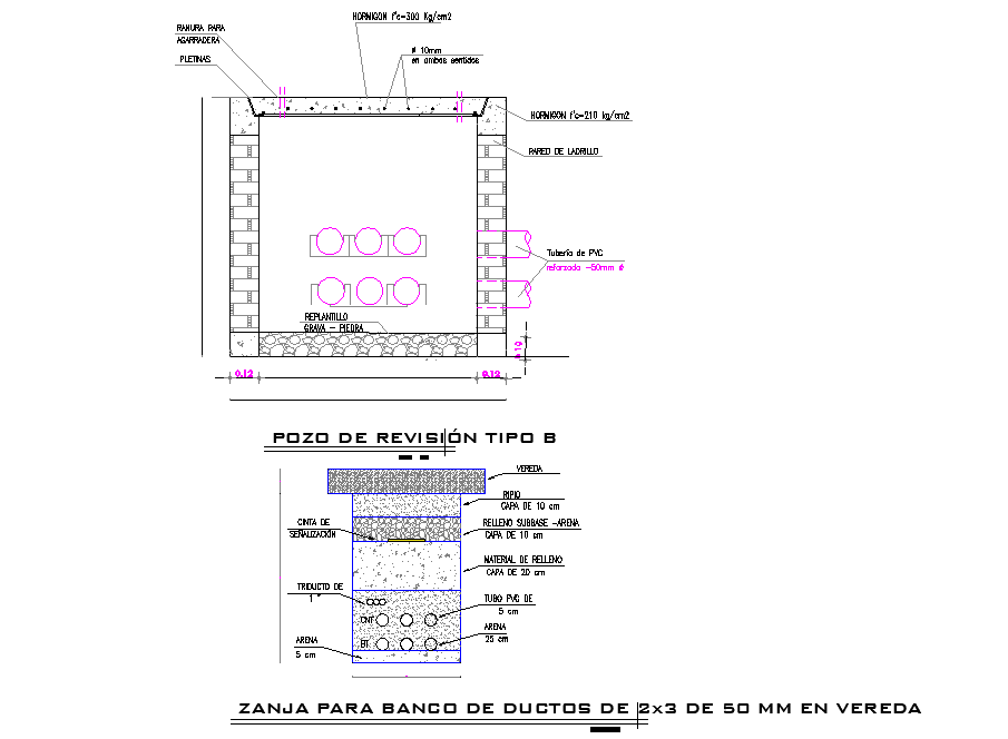 Electric well type by zanja autocad file, pipe line detail, stone detail, concrete mortar detail, naming detail, dimension detail, hole detail, etc.
