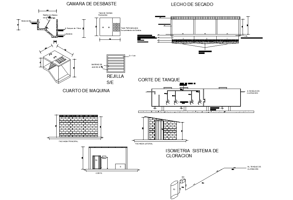 Roughing chamber and drying bed detail dwg file, dimension detail, naming detail, brick wall detail, front elevation detail, side elevation detail, back elevation detail, hatching detail, concrete mortar detail, etc.