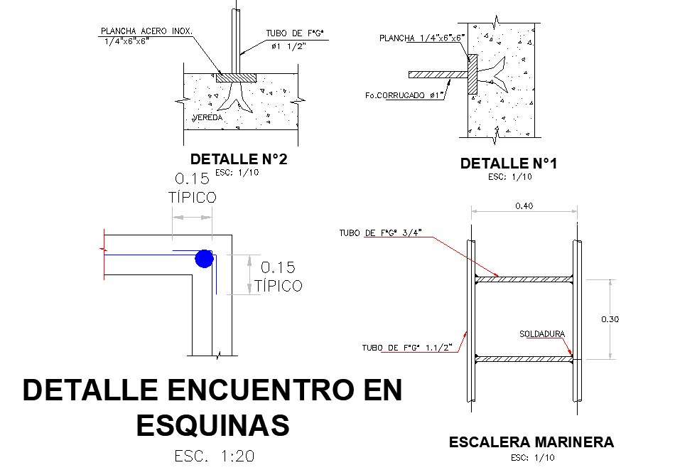 Detail encounter in corners autocad file, scale 1:20 detail, reinforcement detail, dimension detail, naming detail, etc.