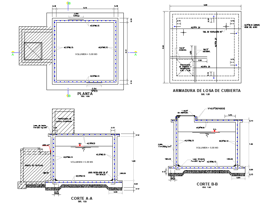Reservoir 5 m3 plan and section layout file, section A-A’ detail, section B-B’ detail, dimension detail, naming detail reinforcement detail, bolt nut detail detail, hatching detail, etc.