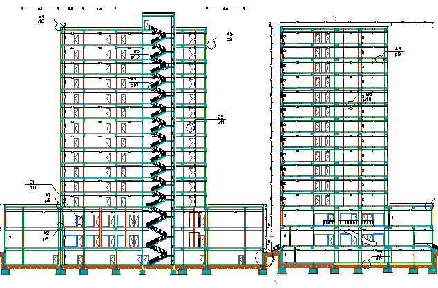 Front and back sectional view of office and commercial building that includes a detailed view of main section, back section, flooring view, doors and windows view, staircase sectional view, wall design and much more of building section.