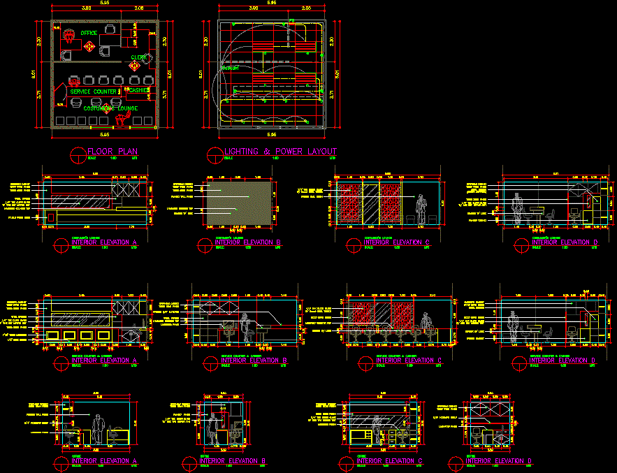 Financing office interior design drawing is given. modern interior design, all elevations, and ceiling design of the financing office are noted.