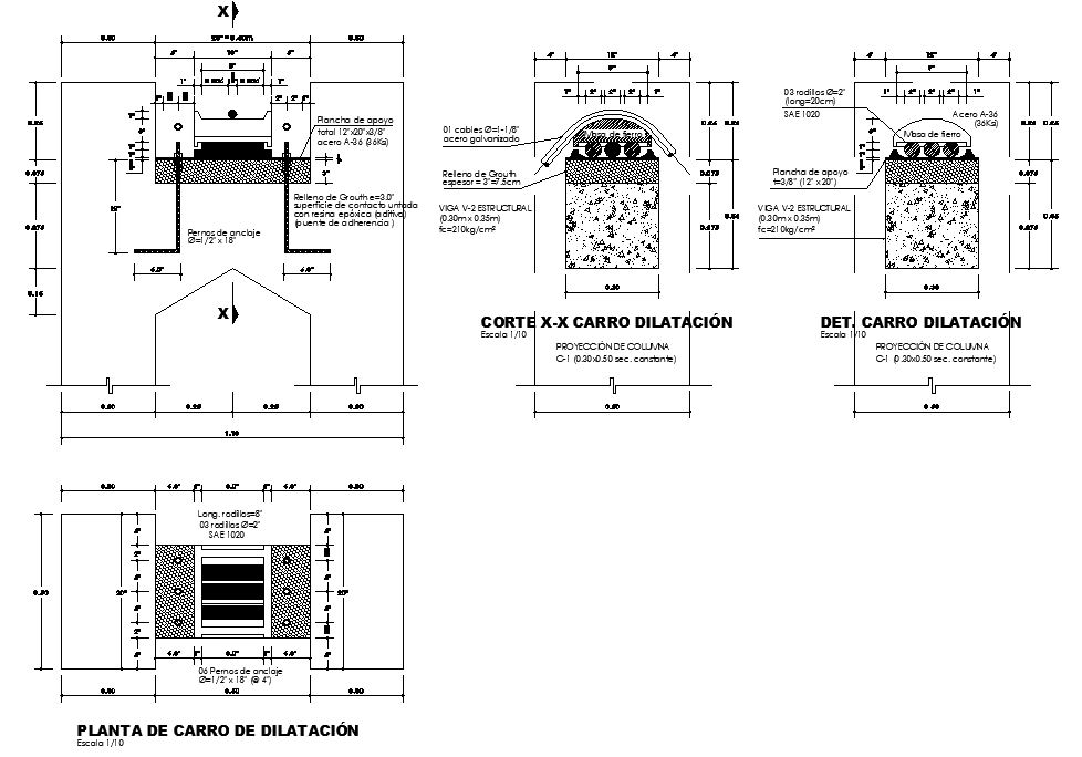 Dilatation car plant layout file, plan and section detail, section X-X’ detail, dimension detail, naming detail, hatching detail, section line detail, concrete mortar detail, reinforcement detail, bolt nut detail, etc.