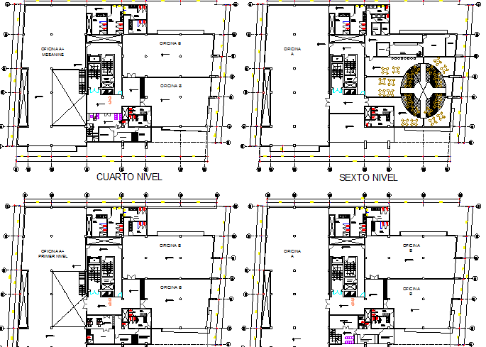 Finance office building floor plan layout details that includes a detailed view of ground floor, first floor, top floor with main entry and exit door, reception area, front desk, waiting and seating area, employee desk, corporate offices, head offices, manager cabin, conference hall, meeting room, dining area, sanitary facilities and much more of building floor plan.