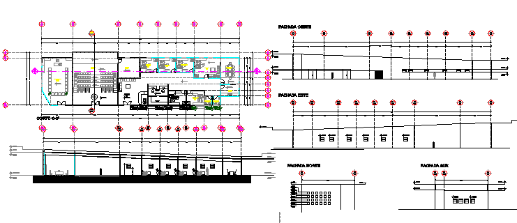 One story administration office elevation, section and layout plan details that includes a detailed view of main elevation view, main sectional view, doors and windows view, roof view, main entry and exit door, reception area, front desk, waiting and seating area, employee desk, corporate offices, head offices, manager cabin, conference hall, meeting room, dining area, sanitary facilities and much more of administration office.