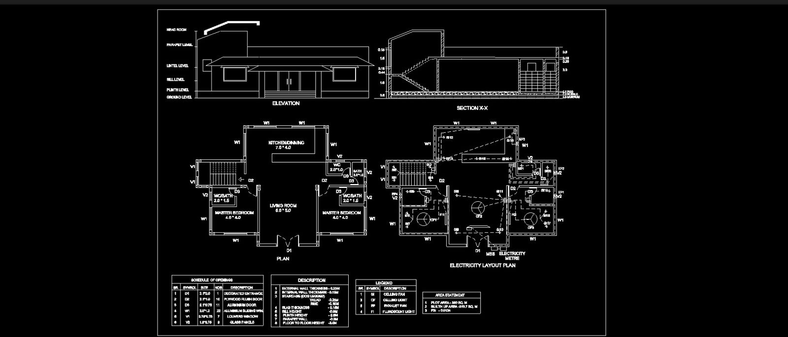 Budget house plan. Plan with section, elevation, electrical layout and ground floor plan. Simple House Construction.