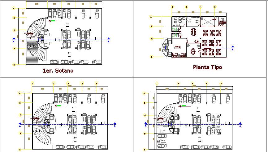 Basement and first floor layout plan details of seven story office building that includes a detailed view of car ramp, indoor roads, specified car space, entry and exit gate, waiting area, reception area, general seating area, passage, offices, head offices, dining area, departmental desks, service area, cafeteria, meeting room, conference hall and much more of office building floor plan.