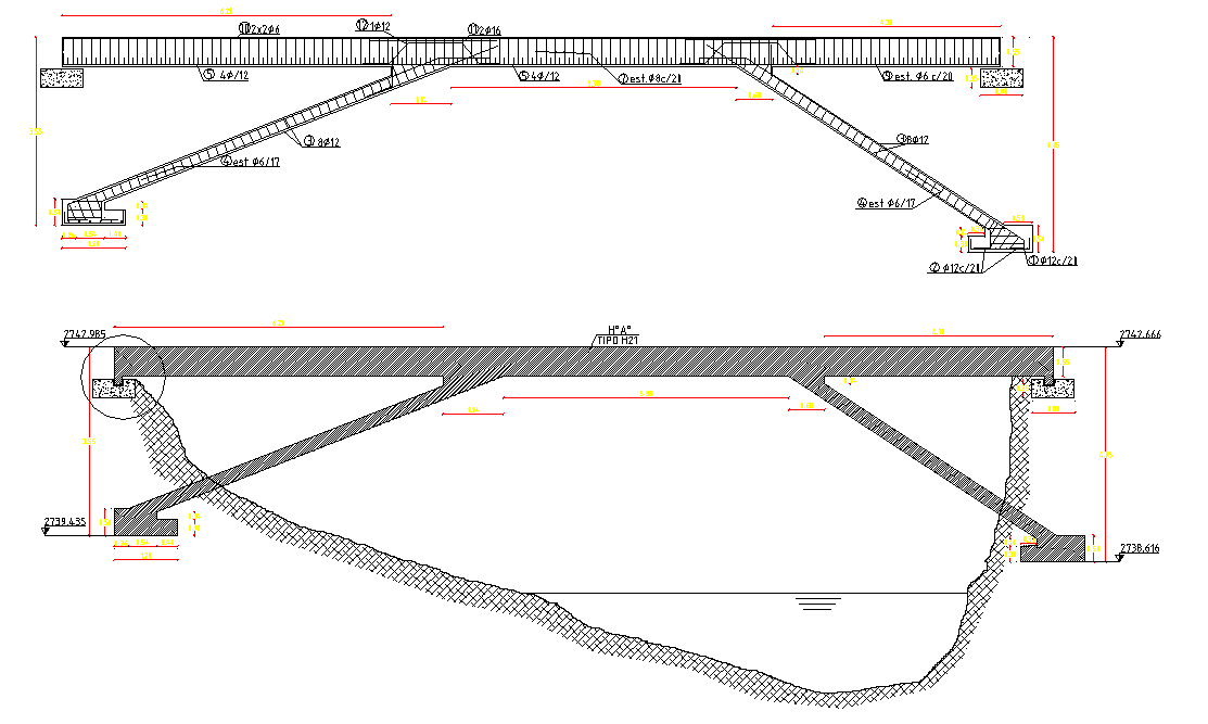 Bridge plan and section dwg file, reinforcement detail, bolt nut detail, hatching detail, dimension detail, naming detail, etc.