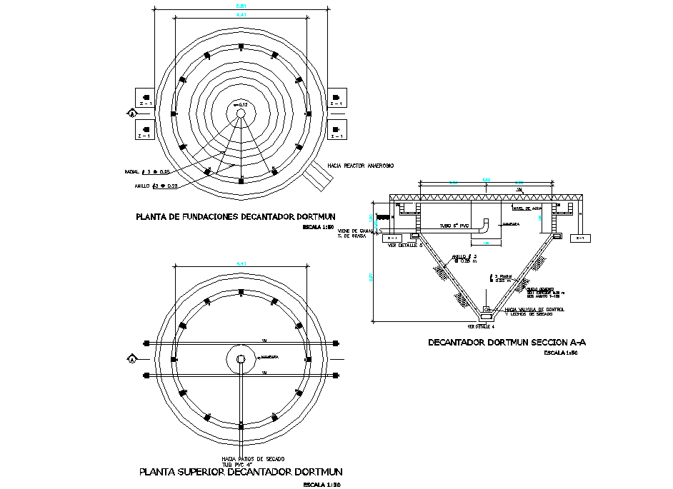 Circular tank plan and section layout file, dimension detail, naming detail, reinforcement detail, bolt nut detail, section line detail, etc.