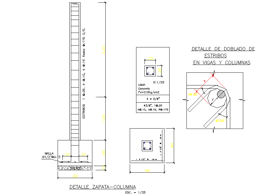 Foundation and column section dwg file, reinforcement detail, scale 1:25 detail, concrete mortar detail, etc.