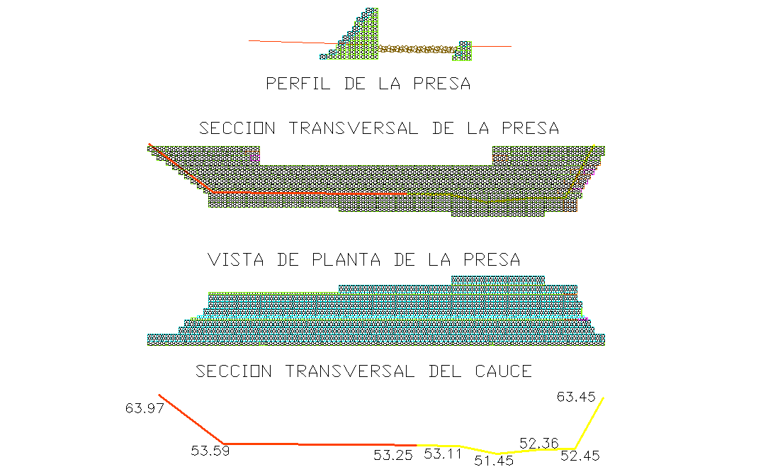 Section Dam capitation plan layout file, hatching detail, leveling detail, section line detail, etc.