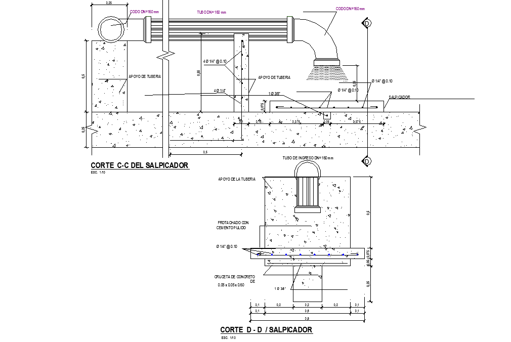 Section Residual water treatment plant autocad file, section C-C’ detail, section D-D’ detail, section line detail, dimension detail, naming detail, concrete mortar detail, etc.