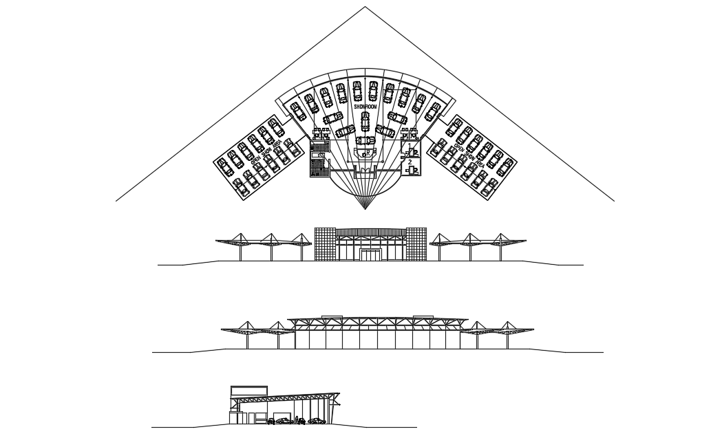 Motor show room dealer ship with plan and elevation dwg file in plan with view of show room view with car view with its office area view and view of elevation with view of floor view with view of show