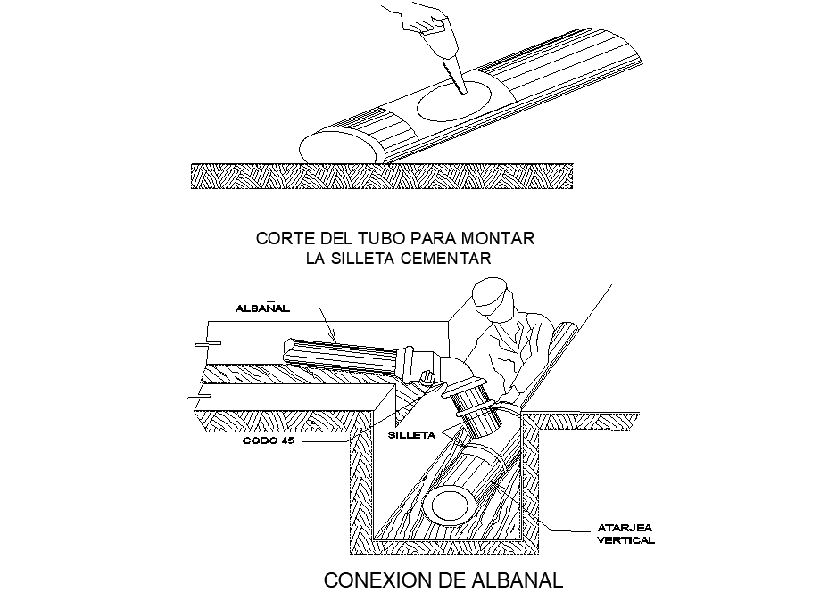 Albanal connection section and isometric view detail dwg file, naming detail, pipe line detail, hatching detail, wooden material detail, etc.