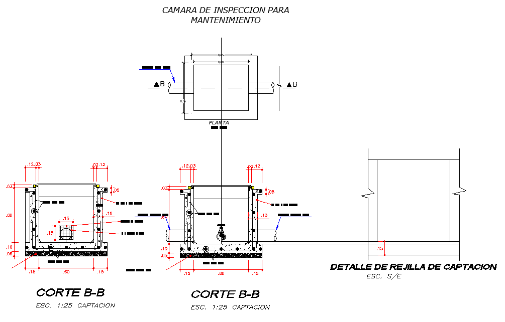 Inspection camera for maintenance layout file, scale 1:25 detail, dimension detail, naming detail, bolt nut detail, reinforcement detail, pipe line detail, section lien detail, section B-B’ detail, etc.