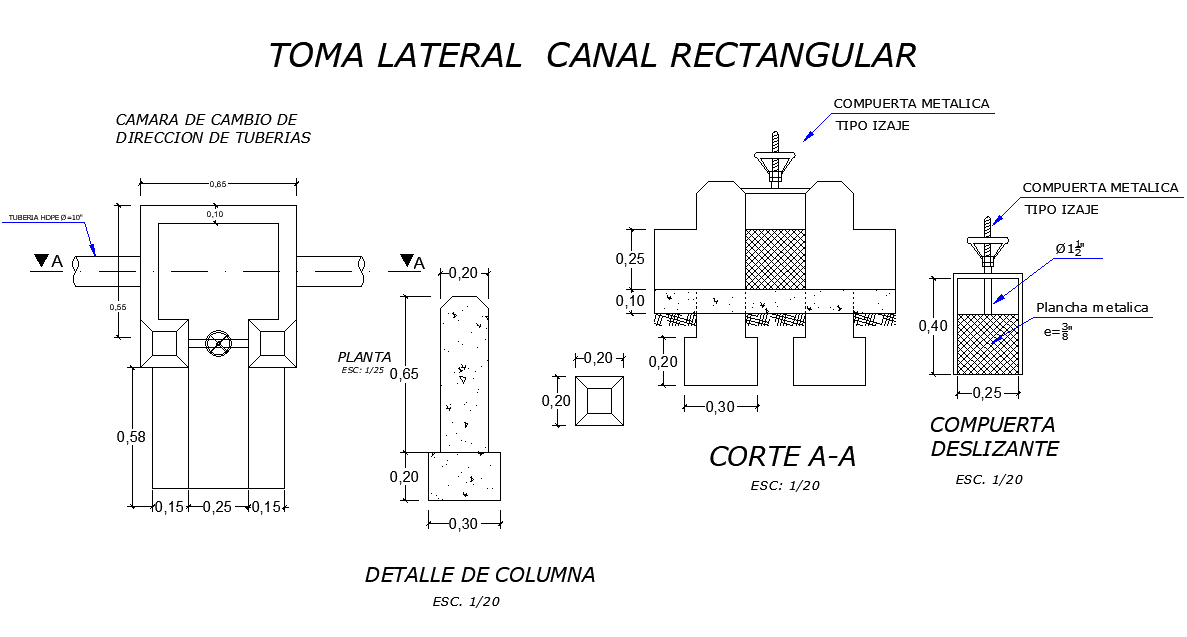 Rectangular channel side take dwg file, column section detail, dimension detail, naming detail, scale 1:20 detail, section A-A’ detail, centre line detail, hatching detail, etc.