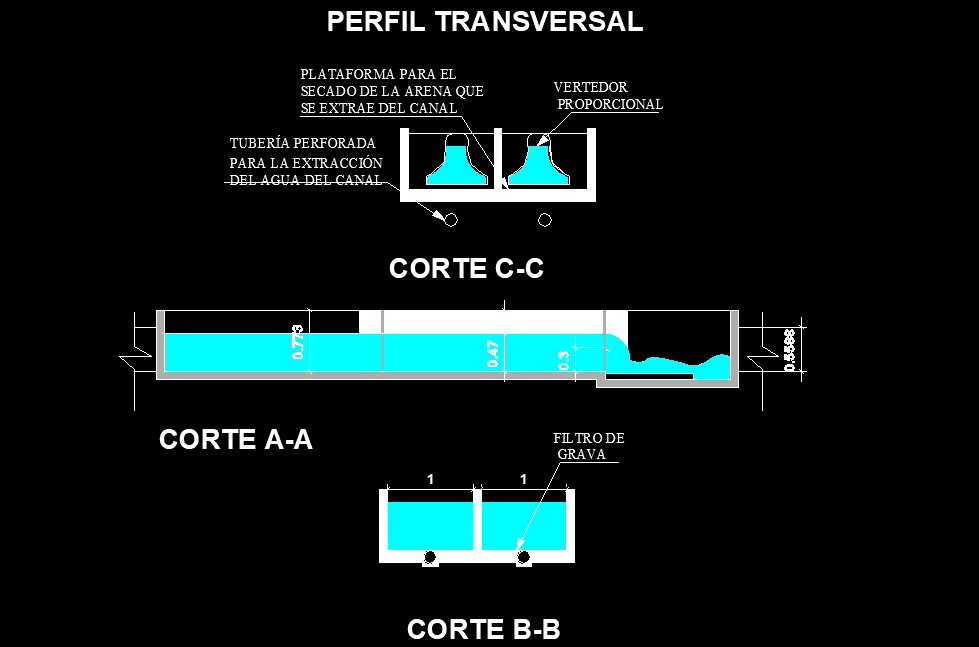 Tank section plan layout file, section A-A’ detail, section B-B’ detail, section C-C’ detail, hatching detail, dimension detail, etc.