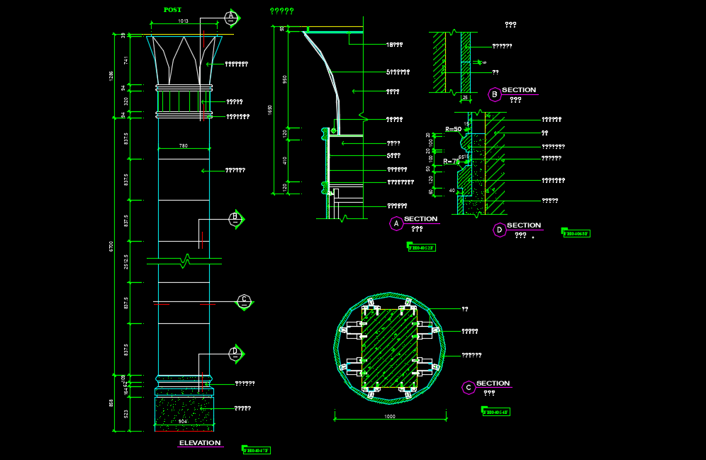 Stone column view with its elevation plan and section detail dwg file