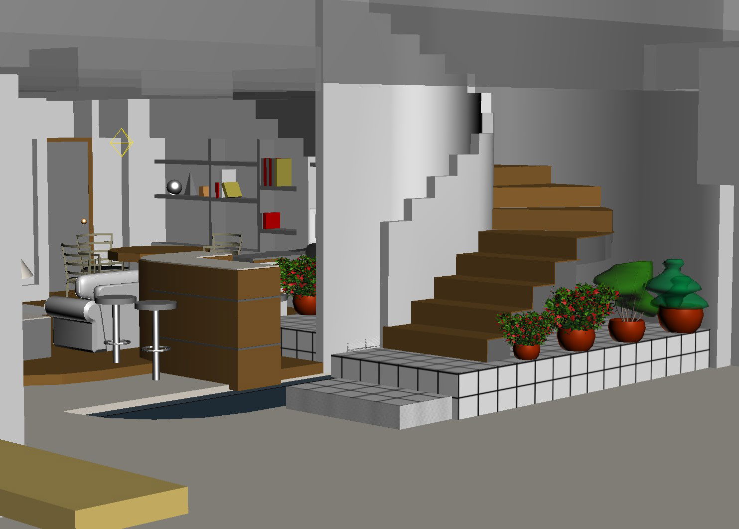 3 d house interiors plan detail dwg file, landscaping detail in tree and plant detail, stair section detail, furniture detail in table, chair, cub board and sofa detail, book detail, etc.