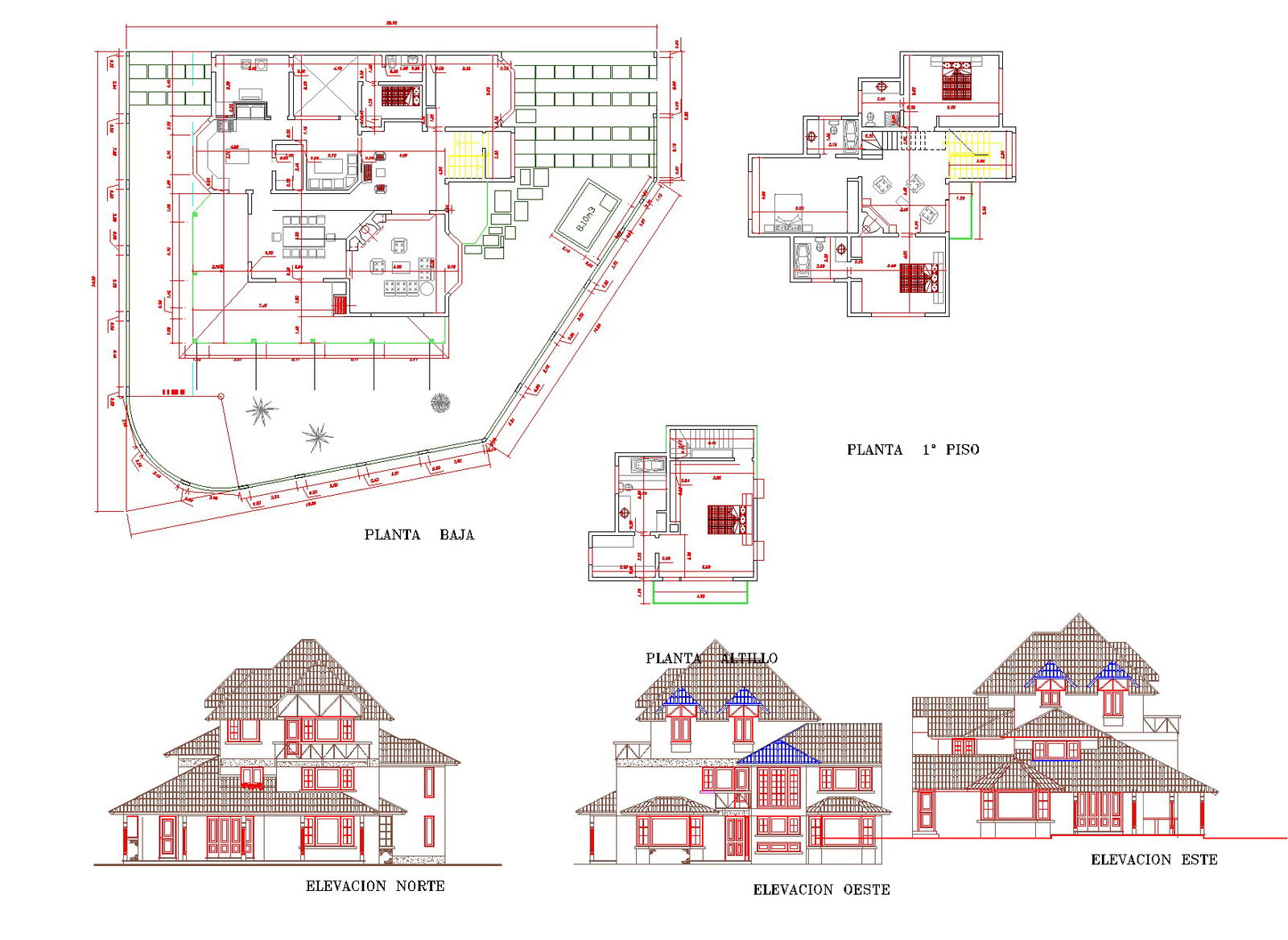 Family house plan and elevation autoacd file, front elevation detail, side elevation detail, back elevation detail, roof section detail, dimension detail, naming detail, roof detail, stair detail, landscaping detail in tree and plant detail, etc.