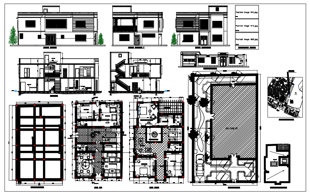 Bungalows of 3 bedroom floor plan and elevation with architecture view dwg file